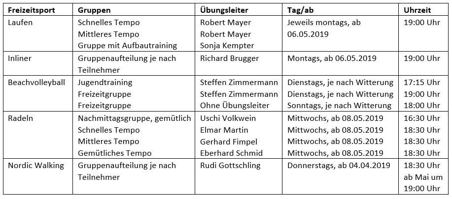 Unten eine  Übersicht über unser Sommerprogramm. Treffpunkt der Freizeitgruppen ist wie immer in der Arnacher Dorfmitte vor dem Feuerwehrhaus. Unsere Nordic Walker rund um Rudi Gottschling sind schon das erste Mal ausgeschwärmt. Die Läufer, Inliner und Radler starten in der Woche ab 6. Mai. Bei den Läufern gibt es auch in diesem Jahr wieder eine Aufbaugruppe um Sonja Kempter, die Lauf-Anfänger nach einem bewährten Programm ans Laufen ranführt. Hier sind Frauen, Männer und gerne auch Jugendliche herzlich willkommen. Für alle, die den Laufsport schon lieben, gibt es in diesem Jahr wieder 2 Gruppen, damit sich keiner unter- oder überfordert fühlt.