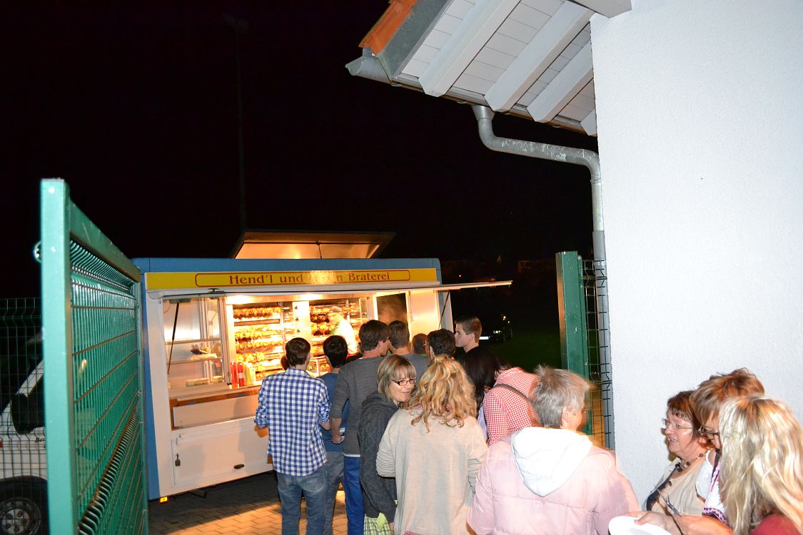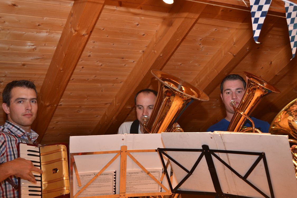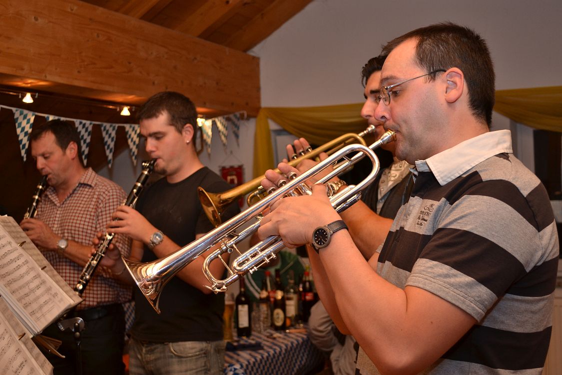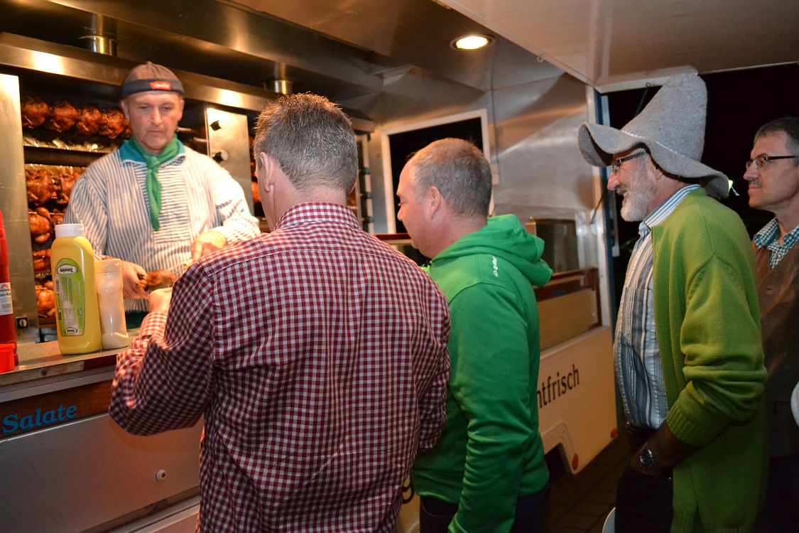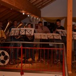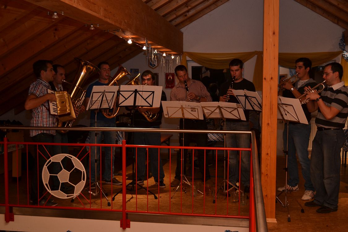 Pünktlich um 20.00 Uhr stand dann auch schon die erste Überraschung parat. Ein „Hähnchenwagen“ vom Bodensee stand vor dem Sportheim und belieferte die hungrigen Gäste mit einem sogenannten „Grillteller“: Hähnchen, Haxen, Spare-Ribs mit Pommes und Wedges waren im nu auf den Tellern verteilt und so nahm der Abend seinen gemütlichen Verlauf. Kurz vor 23 Uhr trafen dann die musikalischen Gäste ein. „ExBIERience“, die kleine Blasmusikbesetzung des Musikvereins Arnach spielte
