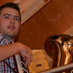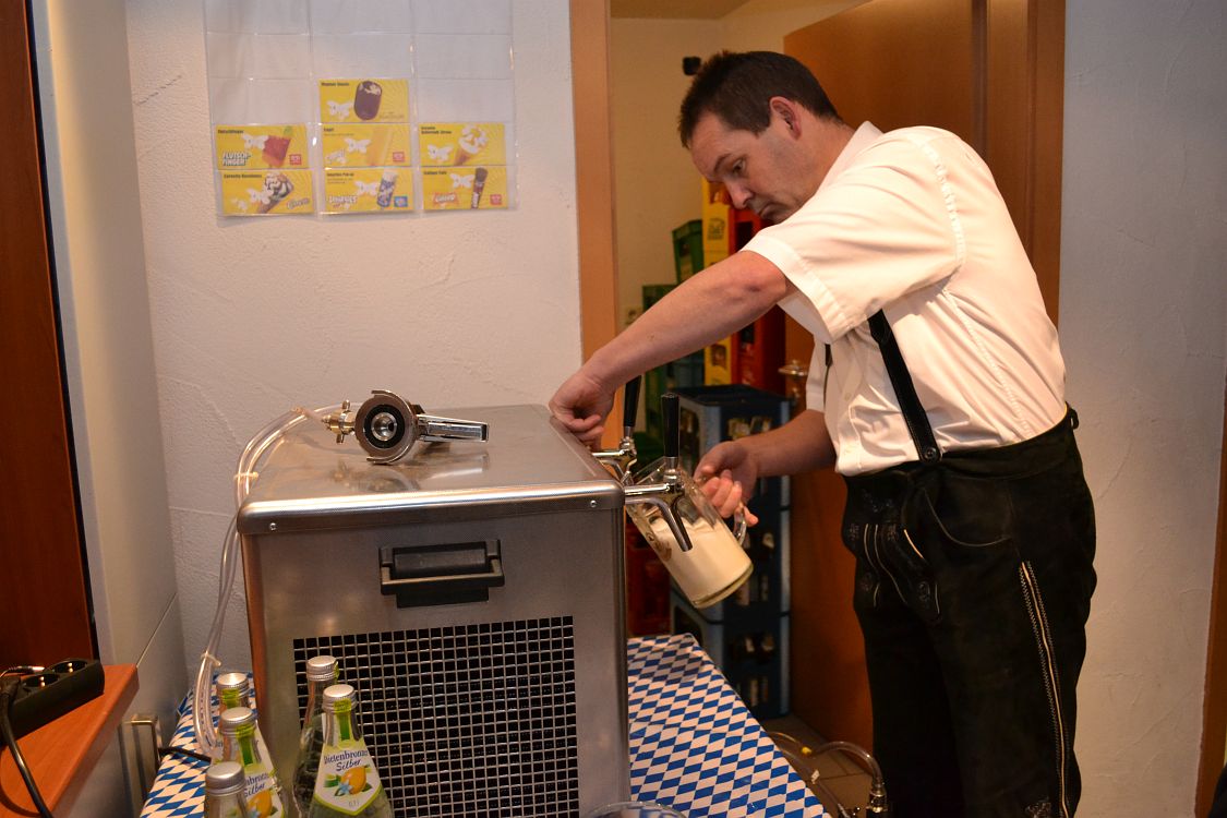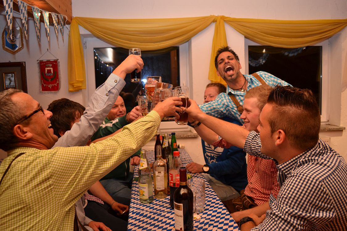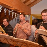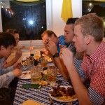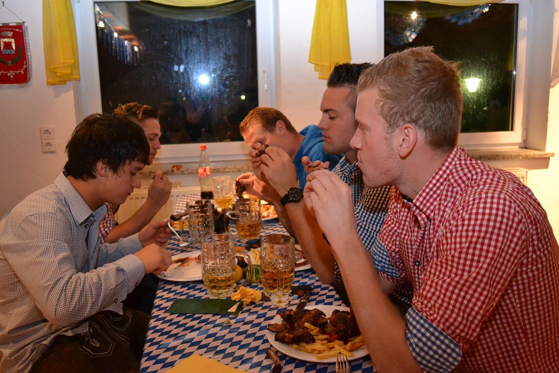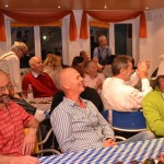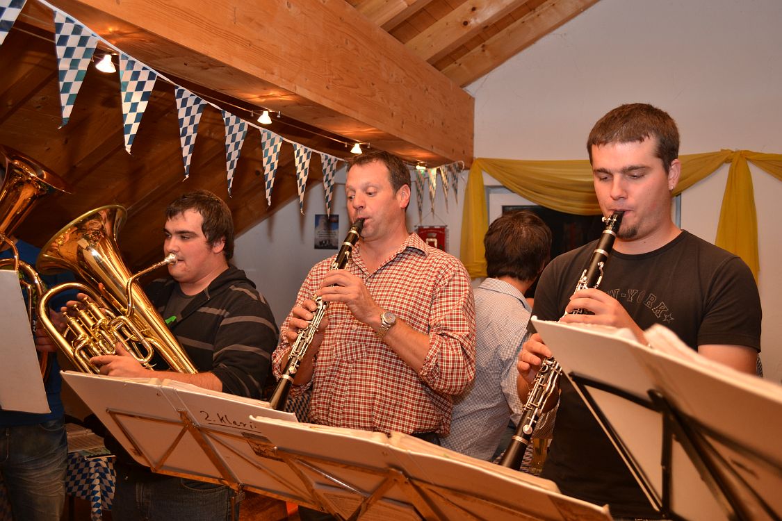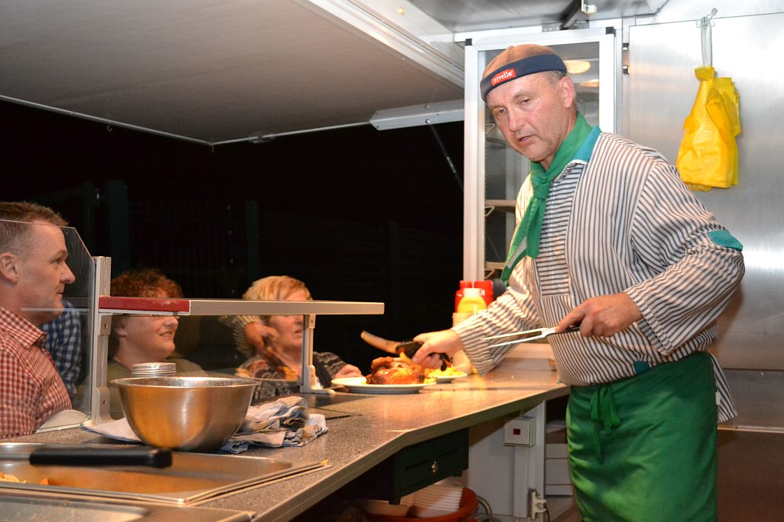 Pünktlich um 20.00 Uhr stand dann auch schon die erste Überraschung parat. Ein „Hähnchenwagen“ vom Bodensee stand vor dem Sportheim und belieferte die hungrigen Gäste mit einem sogenannten „Grillteller“: Hähnchen, Haxen, Spare-Ribs mit Pommes und Wedges waren im nu auf den Tellern verteilt und so nahm der Abend seinen gemütlichen Verlauf. Kurz vor 23 Uhr trafen dann die musikalischen Gäste ein. „ExBIERience“, die kleine Blasmusikbesetzung des Musikvereins Arnach spielte