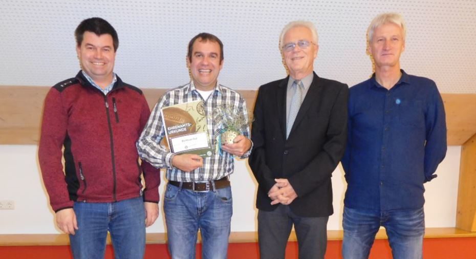 Foto (von links): Gerald Barensteiner (stellv. Abteilungsleiter Fußball SV Arnach), Berthold Ruf, Hans-Peter Walser (Ehrenamtsbeauftragter des Bezirks Bodensee) und Ralf Quednau (Abteilungsleiter Fußball SV Arnach)