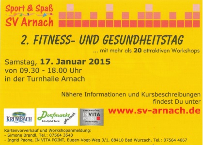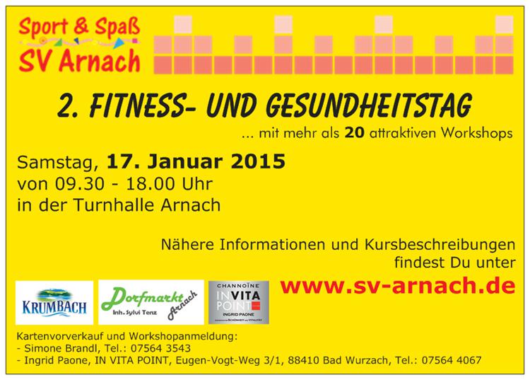 Der Sportverein Arnach lädt am Samstag, 17. Januar 2015 zum zweiten Fitness- und Gesundheitstag in die Turnhalle Arnach ein. Tolle Workshops rund um Bewegung, Gesundheit und Wohlfühlen werden auf 4 Ebenen angeboten. Die einzelnen Workshops (Übersicht als Download) findest Du in unten stehender Tabelle mit den jeweiligen Kursbeschreibungen (einfach auf die Uhrzeit klicken).