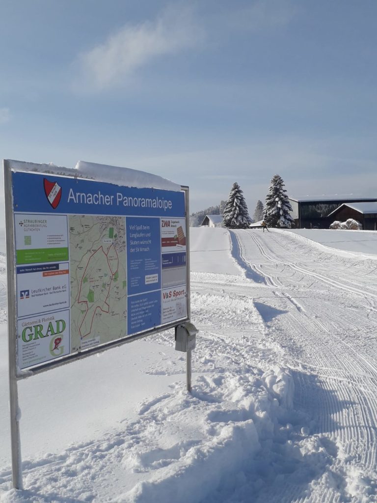 Die leichte Dorfrunde läuft ohne größere Steigungen über 1,5 km in Dorfnähe. Auf der Panoramaloipe können sich sowohl sportlich ambitionierte Läufer als auch Natur- und Landschaftliebhaber auf der 5,5 km langen Strecke auspowern. Die rot klassifizierte Loipe geht im großen Bogen nahe Immenried vorbei und über den Aussichtspunkt bei Schlesis zurück nach Arnach. Dabei ist etwas mehr Kondition und Technik gefragt, da einige Anstiege und Abfahrten zu meistern sind.