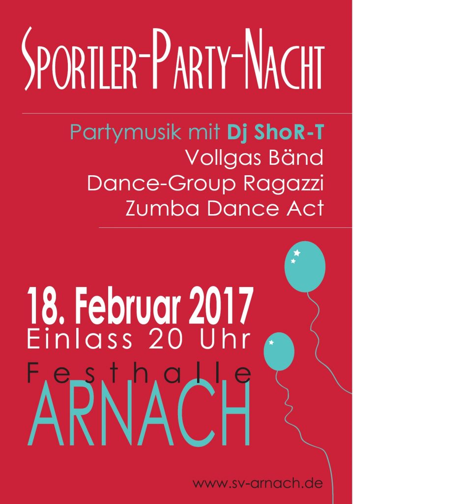 Der Sportverein Arnach lädt am Samstag, den 18. Februar 2017  zur traditionellen Sportler-Party-Nacht in die Turn- und Festhalle Arnach ein.