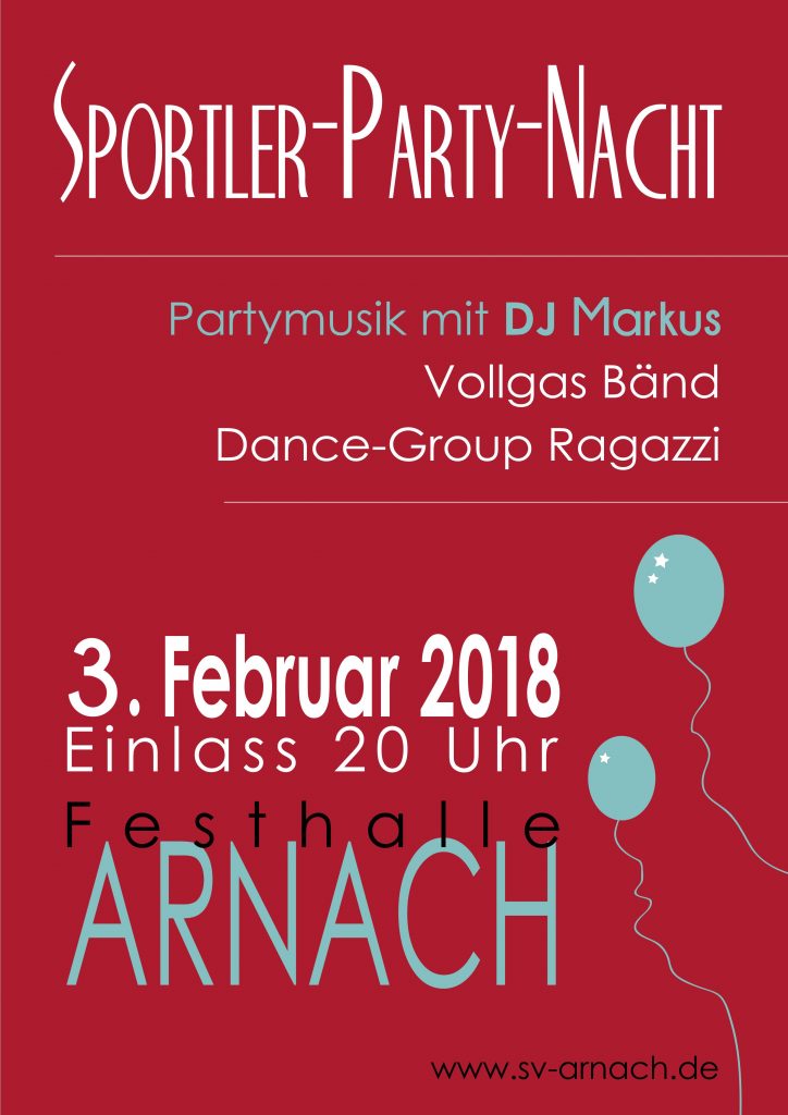 Der Sportverein  Arnach lädt am Samstag, den 03. Februar 2018  zur traditionellen Sportler-Party-Nacht in die Turn- und Festhalle Arnach ein.