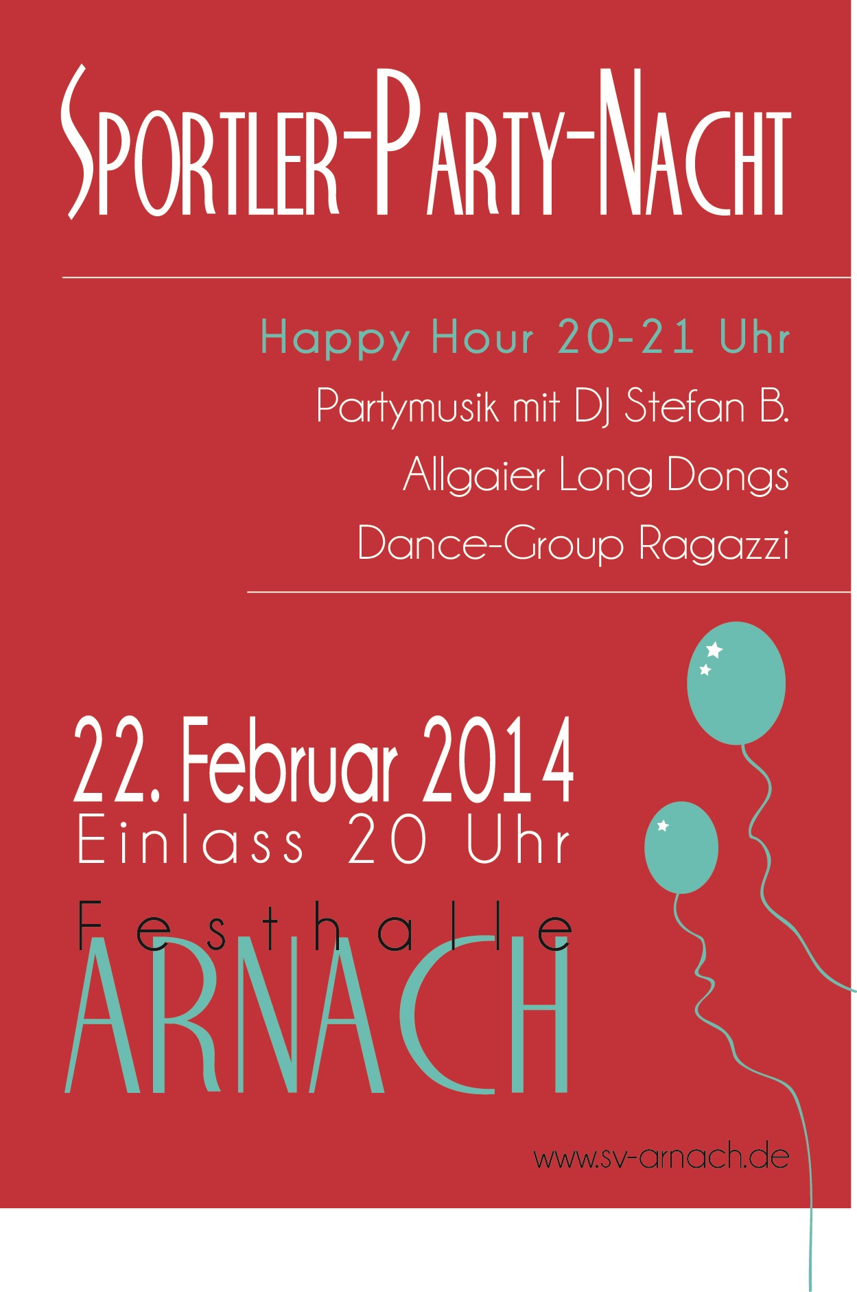 Der Förderverein Sportjugend Arnach lädt am Samstag, den 22. Februar 2014 wieder zur Sportler-Party-Nacht in die Turn- und Festhalle Arnach ein. In bewährter Weise wird DJ Stefan mit den besten Party-Krachern für beste Stimmung in der Halle sorgen. Die „Allgaier Long-Dongs“ sind in diesem Jahr wieder zu Gast und werden mit ihren musikalischen Einlagen die Stimmung auf den Höhepunkt bringen. Als weiteres Highlight wird unsere Dance-Group Ragazzi für tolle Tanzeinlagen sorgen.Die Veranstaltung beginnt um 20.00 Uhr. Für 16- und 17-jährige Party-Besucher gilt die Party-Pass-Kontrolle. Wer noch keinen Party-Pass besitzt, kann diesen zuvor im Internet unter www.party-pass.de herunterladen. Vollmachten werden nicht angenommen. Der Förderverein Sportjugend Arnach freut sich auf viele gut gelaunte Party-Gäste.