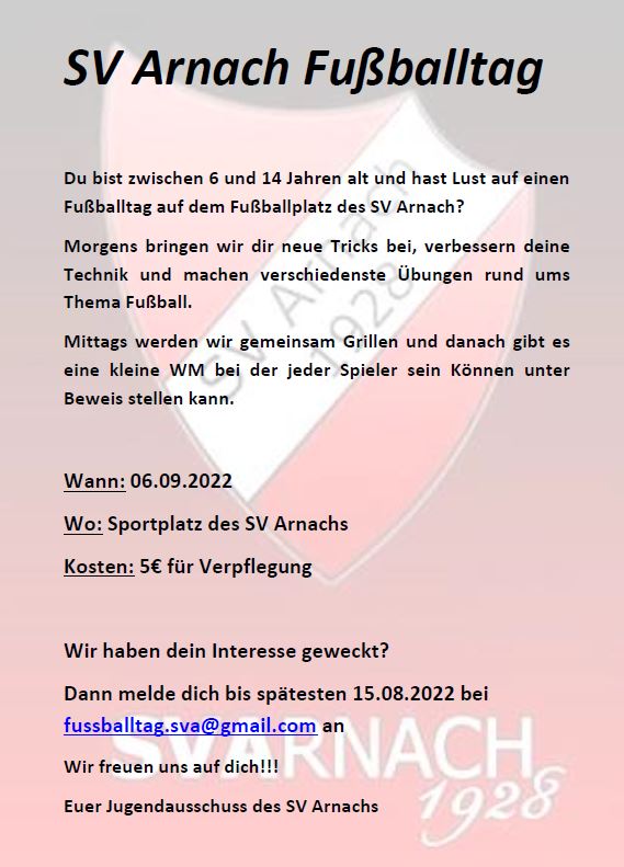 Du bist zwischen 6 und 14 Jahren alt und hast Lust auf einen Fußballtag auf dem Fußballplatz des SV Arnach?