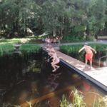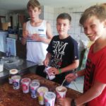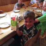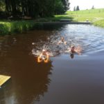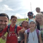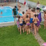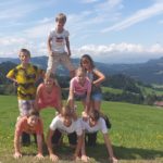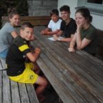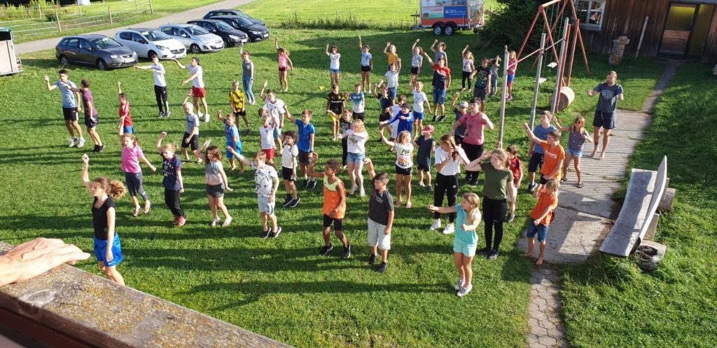 Um 10.30 Uhr trafen sich alle Fela Teilnehmer, Eltern und Betreuer zum Gottesdienst in der Arnacher Kirche. Danach machten wir uns erfreut auf nach Sulzberg. Im Ferienhaus angekommen, bezogen wir unsere Zimmer und wurden in die Gruppen eingeteilt. Wir überlegten und einen Teamnamen und bemalten unseren Wimpel auch wenn es vielen Schwerviel kreativ zu werden. Da so schönes Wetter war wurde der Pool geöffnet. Fabian und Amy holten sich auch eine „freiwillige“ Erfrischung. Zum Abendessen gab es dann Leberkäs´ mit Kartoffelsalat. Ein Hoch auf die Köchinnen!